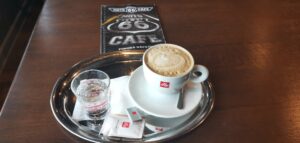 Pozornosť si zaslúži aj nápojový lístok. Majú bohatú ponuku kávových nápojov a iných obľúbených tekutín. Medzi kávy patria klasiky ako espresso, americano a cappuccino, ako aj rôzne ochutené varianty, napríklad espresso s karamelom či vanilkovým sirupom. K dispozícii je tiež široký výber čokolád, vrátane horkej a mliečnej, a zákazníci si môžu vybrať aj z ponuky čerstvých štiav, ako sú pomarančová a grepová. Okrem toho ponúkajú aj chladené nápoje vrátane rôznych druhov sódy a nealkoholických nápojov. A pre milovníkov čaju je na výber Julius Meinl Bio čaj v niekoľkých príchutiach. Z nápojového lístka sme si vybrali cappuccino. Cappuccino bolo servírované v bielej porcelánovej šálke s logom spoločnosti Illy a s pohárom vody. V kaviarni servírujú kávu značky Illy, ktorá bola založená v roku 1933 vo vzdialenom talianskom Terste. Cappuccino pripravené z kávy Illy bolo servírované s charakteristickou hustou penou navrchu a jeho chuť bola vyvážená. Vydali sme sa sem, pretože nás oslovila motorkárska tematika a hľadali sme miesto, kde by sme mohli spojiť našu vášeň pre motorky a zároveň si vychutnať kvalitnú kávu. A práve tu, v kaviarni MOTO 66 CAFE, sme našli to pravé miesto, kde každá šálka kávy je ako jazda na motocykli – plná dobrodružstva a slobody.
