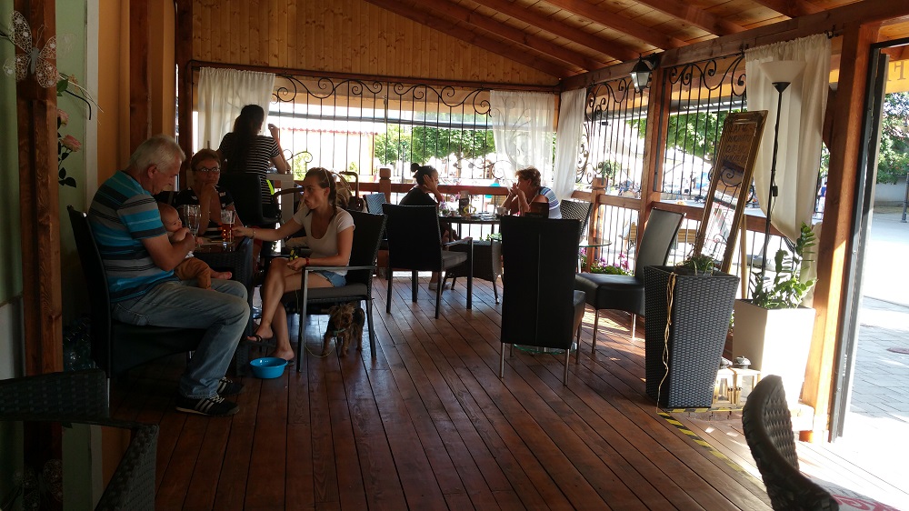 Vybrali sme si miesto v rohu, kde boli vysoké barové stoličky. Terasa bola upravená veľmi pekne, čierne kožené stoličky, sklenený stôl alebo biela záclona proti priamemu slnečnému svetlu. Letná terasa má obsadenie približne pre 16 osôb, čo je podľa môjho názoru primerané. Na každom stole sa nachádzal nápojový lístok spolu s popolníkom, nakoľko je v interiéri zákaz fajčenia a povolené je len na terase.