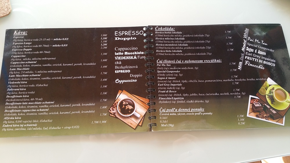 Nápojový lístok bol jednoduchý, vo forme notesu, ladený do farieb tmavej kávy. Kaviareň má na výber mnoho druhov káv značky Musetti, horúcu čokoládu, rôzne čaje atď. Prekvapením pre mňa bolo, že som nápojový lístok prečítala celý 2krát, ale nikde som nenašla miešané drinky alebo limonády. Ceny boli veľmi prijateľné.