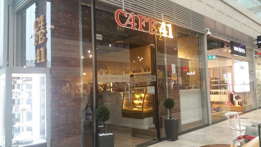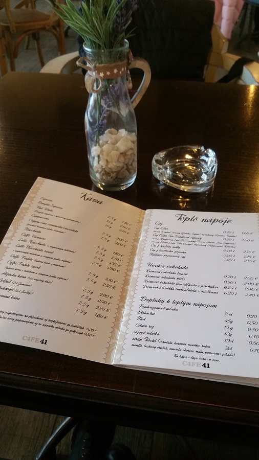 Už z diaľky sme videli na stoloch popolníky a miesta bolo naozaj na vyberanie. Kaviareň bola z časti presklená. Nad jej vchodom sa nachádzal veľký názov kaviarne, a to Café 41. Už názov sa nám hneď zapáčil, ani nevieme prečo. Kaviareň mala k dispozícií aj nefajčiarsku časť, ktorá sa nachádzala pred kaviarňou.