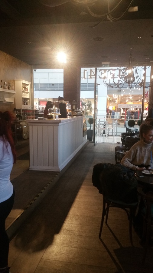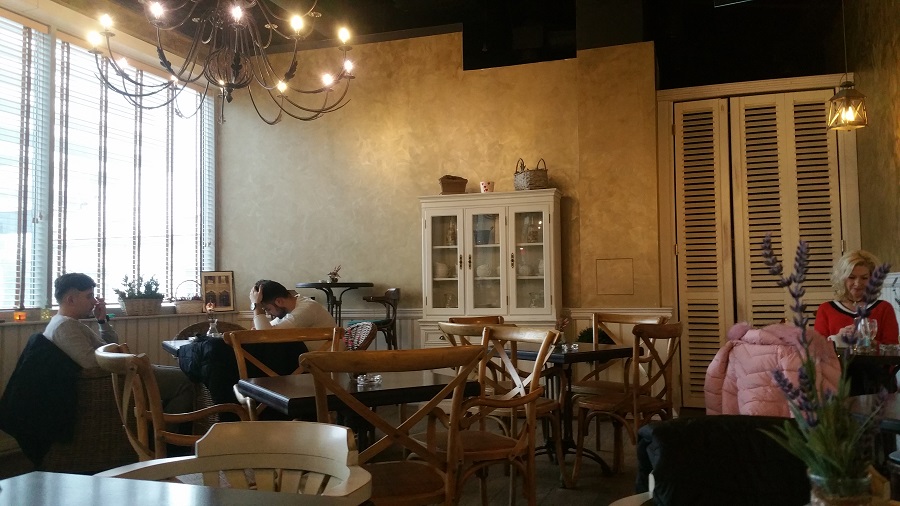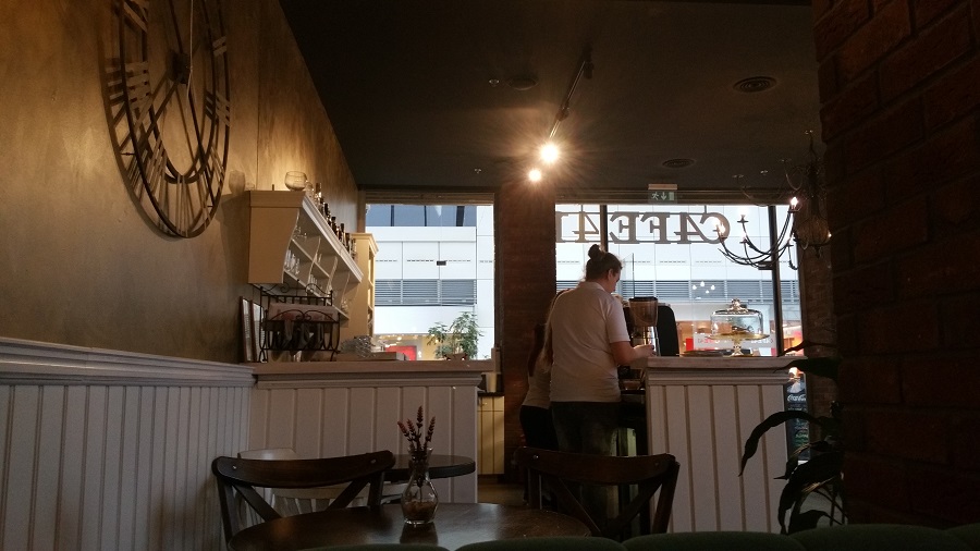 Kaviareň bola dostatočne osvetlená denným svetlom, nakoľko bola veľká časť presklená. Interiér bol ladený do hnedej a béžovej farby, plus ich odtiene. Všetko pôsobilo veľmi pekne. Nábytok a ostatné dekorácie mi pripomínali iné storočie. Osobne sa mi tento štýl veľmi páčil, lepšie povedané, bola som vo svojom.