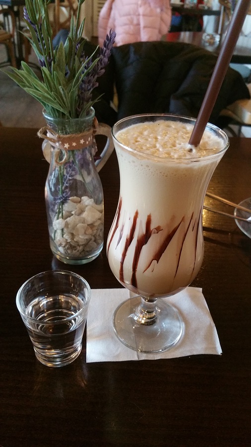 Po krátkej chvíli sme mali pred sebou svoje nápoje. Osobne som si objednala ľadovú kávu. Musím sa priznať, pila som možno 2 ľadové kávy, ktoré mi naozaj chutili. Ostatné boli zväčša ako voda s ľadom. V tomto prípade to tak nebolo. Toto bola asi tá najlepšia ľadová káva, akú som kedy pila. Esteticky vyzerala veľmi chutne a lahodne. Jej konzistencia bola konečne krémová a chuťovo bola doplnená úžasne. Bola som nesmierne spokojná.