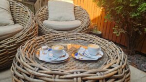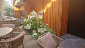 Výsledkom rekonštrukcie je útulný interiér s pohodlným dizajnovým sedením, množstvom prírodných materiálov a zelene. Priestory sú osvetlené tak, aby vytvárali príjemnú atmosféru a vďaka kvalitnému espresso stroju vonia celá kaviareň kávou. Interiér je rozdelený na fajčiarsku a nefajčiarsku zónu. Exteriér kaviarne vás očarí svojou jednoduchosťou a eleganciou. Drevené obloženie stien, fontána doplnená kvitnúcimi rastlinami a sviežou zeleňou vytvára atmosféru, ktorá pozýva na oddych. Pohodlné prútené sedenie, doplnené mäkkými vankúšmi, je zasadené do príjemného prostredia, kde sa môžete skryť pred každodenným zhonom. Každý detail od nábytku po osvetlenie akoby šepkal: „Tu si oddýchnete.“