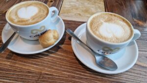 Kým sme si vyberali z bohatého menu, všimli sme si, že ponuka Café Dias je naozaj široká. Nájdete tu nielen rôzne druhy kávy, ale aj čaje, kvalitné kakao, osviežujúce limonády a dokonca aj koktailové zmesi. Na výber sú tiež rôzne sladké a slané pochutiny – domáce zákusky, chrumkavé panini či sušienky. V regáloch si môžete zakúpiť aj darčekové produkty ako lyofilizované ovocie, čokolády alebo balenia kávy, ktoré sú ideálne ako darček pre niekoho blízkeho. My sme si objednali cappuccino, ktoré bolo naozaj vynikajúce. Káva bola podávaná v krásnych bielych keramických šálkach s logom kaviarne položených na elegantných bielych podšálkach. Ku káve bol priložený malý jemný zákusok, ktorý dodal kávovému zážitku sladký dotyk. Cappuccino bolo perfektne pripravené – lahodná káva s bohatou krémovou vrstvou peny a jemným vzorom na vrchu. Chuť kávy bola vyvážená a plná s jemným nádychom sladkosti, ktorá dokonale harmonizovala s textúrou mliečnej peny. Obsluha v Café Dias bola tentokrát veľmi milá a ochotná. Všetko bolo pripravené s dôrazom na detail, čo nám dodalo pocit, že sme na výnimočnom mieste, kde sa kladie dôraz nielen na kvalitu kávy, ale aj na celkový zákaznícky zážitok. Café Dias v Auparku Piešťany je miesto, kde sa oplatí zájsť, ak máte radi pokojné chvíle s knihou a kvalitnou kávou. Tento jedinečný koncept kaviarne a knižnice je výborný pre všetkých milovníkov literatúry, ktorí si chcú vychutnať šálku kávy v príjemnom prostredí. Ak hľadáte miesto, kde si môžete oddýchnuť, ponoriť sa do knihy a zároveň si vychutnať lahodné jedlo a nápoje, Café Dias je pre vás tou pravou voľbou. Café Dias spája dve úžasné veci – lásku ku knihám a vášeň pre kvalitnú kávu. Tento unikátny priestor v Piešťanoch určite odporúčame navštíviť každému, kto si chce dopriať niečo skvelé.