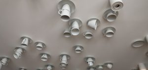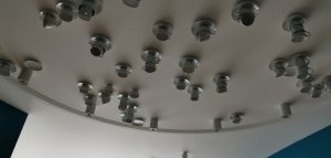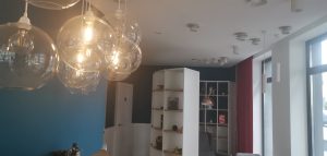 Interiér kaviarne je vyhotovený v škandinávskom štýle a je vskutku originálny. Miestnosť je zariadená v šedých odtieňoch s decentnými tónmi dreva. Však bezpochyby tu dominuje modrá petrolejová farba. Nábytok bol vyrobený na mieru a podlaha je krásna vinylová. Priestor je rozdelený do viacerých zón. Nájdete tu príjemné sedenie pri romantickom krbe, lavicové sedenie, ale tiež sedenie v pohodlných kreslách pozdĺž výkladového presklenia. Zaujímavá je španielska stena prekrývajúca vstupy na sociálne zariadenia, ktorá vytvorila kút na čítanie. Tento knižničný kút okrem milovníkov kníh ocenia aj deti, pretože si v ňom nájdu košík s hračkami. Za dominantný prvok kaviarne sa bezpochyby môže považovať barový pult s vitrínou na dezerty, ktorá upúta nejedného hosťa. Čo však považujem za najväčšiu zvláštnosť kaviarne, je atypický strop, ktorý tvorcovia dotvorili originálnou kolážou kaviarenského porcelánu. Človek tu má tak pocit, že tento porcelán sa vymyká gravitačnému zákonu. Kaviareň je doladená a zútulnená vankúšmi, obrazmi, závesmi, knihami a rôznymi drobnosťami. Kaviareň v letných mesiacoch pre svojich zákazníkom ponúka aj posedenie na vyvýšenej terase. Terasa je zároveň aj vstupným prvkom do kaviarne. Z kaviarne sme boli očarení na prvý pohľad. Usadili sme sa na lavicové sedenie, nad hlavami sme mali šálky a podšálky, a ostávalo nám len veriť, že majstri si svoju prácu odviedli dobre a kávový riad nezačne padať. V tejto zóne sa nám sedelo veľmi dobre, mali sme maximálne súkromie.