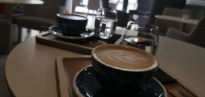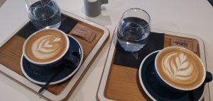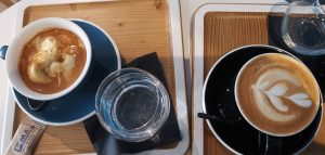 Musím pochváliť aj ponukový lístok, ktorý dotvárali výstižné texty. Objednali sme si 2x cappuccino, kde bolo dopísané – pokiaľ vyhľadávate klasiku, lahodné cappuccino 10g za 1,90€ nič nepokazí. Ďalej sme si objednali Flat white – 20 g za 2,40€, skoro ako kapučinko, ale základ je dvojité espresso, takže sa postará o dávku kofeínu. Neodolali sme ani káve Affogato za 2,80€, ktorú tvorí kopček vanilkovej zmrzliny. Ako som sa dočítala v jednom článku – personál tejto kaviarne prešiel špeciálnym školiacim kurzom Makeit Better, ktorý vedie odborník na kávu a jej prípravu, Filip Beňo. Ten im taktiež pomohol vybrať kávu z brazílskej oblasti. Čiže servírujú 100% Brazíliu. Kávu im však praží slovenská pražiareň Goriffee. Musím uznať, že chuť cappuccina bola naozaj skvelá. Pri káve Flat white kamarátka poznamenala, že je dosť silná. Určite musím vyzdvihnúť, že káva bola podávaná v peknej šálke na krásnej drevenej tácke s pohárom vody. V ponuke majú napríklad sortiment z pivovaru ŽiWELL alebo rôzne variácie limonád od lokálnych dodávateľov. V sezóne jar/leto a jeseň/zima čiastočne obmieňajú svoju ponuku. Z vitrín sa na vás usmievajú zákusky a dokonca niektoré z ich sú vhodné aj pre ľudí so špeciálnymi diétami. Je vidieť, že v kaviarni si potrpia na kvalitu a ja neskrývam svoje nadšenie.