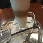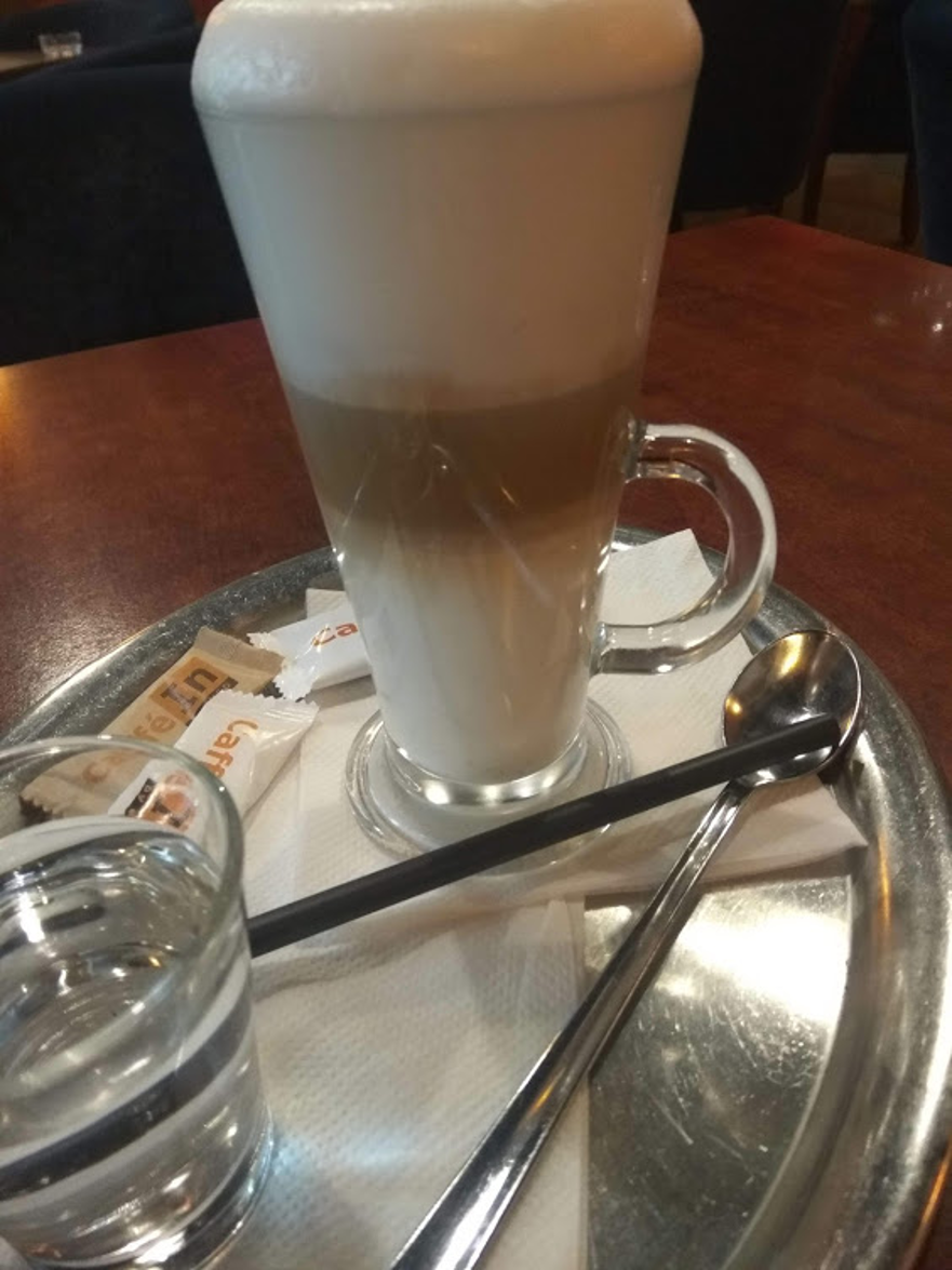 Obsluhu som požiadala o caffe latte. To mi aj o chvíľku priniesla. Servírovanie bolo vkusné. Moju kávu som dostala na striebornej tácke, s pohárom vody, keksíkom, hnedým a bielym cukrom. Slamka, ktorá bola súčasťou servírovania, sa však po chvíli v horúcom nápoji roztopila. Napadla ma iba známa hláška z nemenovaného českého filmu: “Soudruzi z NDR nekde udelali chybu“.
