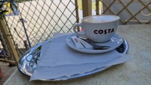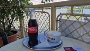 V ponukovom lístku nechýbajú rôzne drinky, limonády, miešané nealkoholické a alkoholické nápoje, kávy, dezerty, zákusky, rôzne pečivo a drobné pochutiny. Z danej ponuky sme si vybrali cappuccino. Neprehliadnuteľným prvkom je podávaná káva značky Costa Coffee. Cappuccino bolo servírované v typickej bielej šálke s logom Costa, na povrchu s dokonalou kresbou z mliečnej peny, čo svedčí o zručnosti baristu. Káva sa vyznačuje bohatou a aromatickou chuťou, ktorá poteší každého milovníka kávy. Prístup personálu bol priateľský.