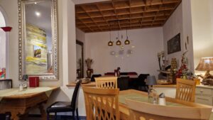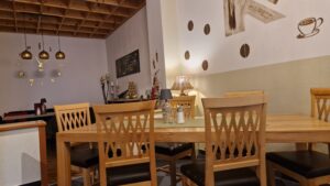 Café Orchidee nás privítala svojím príjemným a útulným interiérom. Kaviareň je rozdelená do viacerých miestností, z ktorých každá má svoj vlastný štýl a jedinečný šarm. Kombinácia prírodných materiálov, ako je drevo a jemných rustikálnych prvkov, vytvára atmosféru domova. Na stenách viseli obrazy s alpskými motívmi, rôzne dekorácie, sviečky na stoloch dotvárali hrejivú náladu a veľké okná púšťali dovnútra jemné denné svetlo. Hneď vedľa kaviarne sa nachádza malé detské ihrisko, čo z nej robí ideálne miesto pre rodiny s deťmi. Pre tých, ktorí si chceli vychutnať výhľad na okolitú prírodu, bola k dispozícii aj malá terasa s výhľadom na jazierko a pohorie.