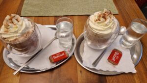 Café Orchidee ponúka širokú škálu jedál a nápojov. Ponúkajú raňajky formou bufetu, ktoré zahŕňali čerstvé pečivo, jemné syry, údeniny, vajíčka, ovocie a lahodné džemy. K tomu sme si objednali ich horúcu čokoládu so šľahačkou, ktorá bola nielen vizuálne príjemná, ale aj lahodná. Na stole nás čakal aj kúsok keksíka Lotus Biscoff, ktorý k čokoláde dokonale ladil. Ich ponuka kávy nás oslovila najviac. Kaviareň podáva kávu značky Schärf, ktorá pochádza priamo z Rakúska. Značka má bohatú históriu – založená bola v roku 1954 Robertom Schärfom, a od svojich začiatkov sa sústredí na kvalitu a precízne praženie kávových zŕn. Už od prvého dúška sme pochopili, prečo si táto značka získala srdcia milovníkov kávy po celom svete. Profesionálna obsluha nám s úsmevom pomohla vybrať si z ponuky. Naše popoludnie v Café Orchidee bolo pohodové. Sedieť na terase s výhľadom na jazierko, počúvať tiché šumenie vetra a vychutnávať si kvalitnú kávu v spoločnosti milých ľudí – to sú momenty, ktoré ostávajú v srdci navždy. Ak niekedy zavítate do Puchbergu am Schneeberg, nenechajte si ujsť návštevu tejto jedinečnej kaviarne. Je to miesto, kde sa čas spomalí a každý okamih dostane nový význam.