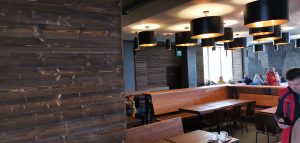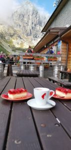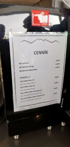 Ako už bolo naznačené, jedná o samoobsluhu, takže kávu sme si „načapovali“ sami a aj zákusok sme si z vitrínky vybrali sami. Prišli sme k pokladni a tam sme už len zaplatili. Musím však uznať, že pokladníčka bola veľmi príjemná pani. Hovorím si, že kiežby všade pracoval takýto ochotný a usmievavý personál. Možno sme mali len šťastie na milú obsluhu, to z jednej návštevy posúdiť neviem. Ale každopádne túto skúsenosť hodnotím veľmi kladne. Na druhej strane ma nemilo prekvapila cena za cappuccino, ktorá sa vyšplhala na 3,60€, očividne malo aj horskú prirážku. V ponuke mali rôzne kávy, čaj, nealkoholické a alkoholické nápoje, dezerty, ale aj veľkú domácu parenú buchtu s vanilkovým pudingom, vyprážaný syr, polievky, klobásky, halušky a veľa iného. Takže ak človek odhliadne od astronomických cien, výber majú naozaj široký.