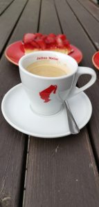 My sme si „načapovali“ espresso lungo v hodnote 2,30€ a ku kávičke sme si dopriali vynikajúci jahodový zákusok. Na moje potešenie kávu podávajú značky Julius Meinl. Na tejto značke sa mi páči, aké má krásne šálky s vlastným logom. Ich logo je vskutku kultové. Zobrazuje muža s červenou pokrývkou hlavy pod názvom fez. Julius Meinl je rakúska spoločnosť, ktorá bola založená v roku 1862 vo Viedni a začínala ako malá rodinná firma. V súčasnej dobe sa stala veľmi žiadanou značkou medzi kávičkármi. Ja túto kávičku hodnotím ako veľmi lahodnú a inšpiratívnu.