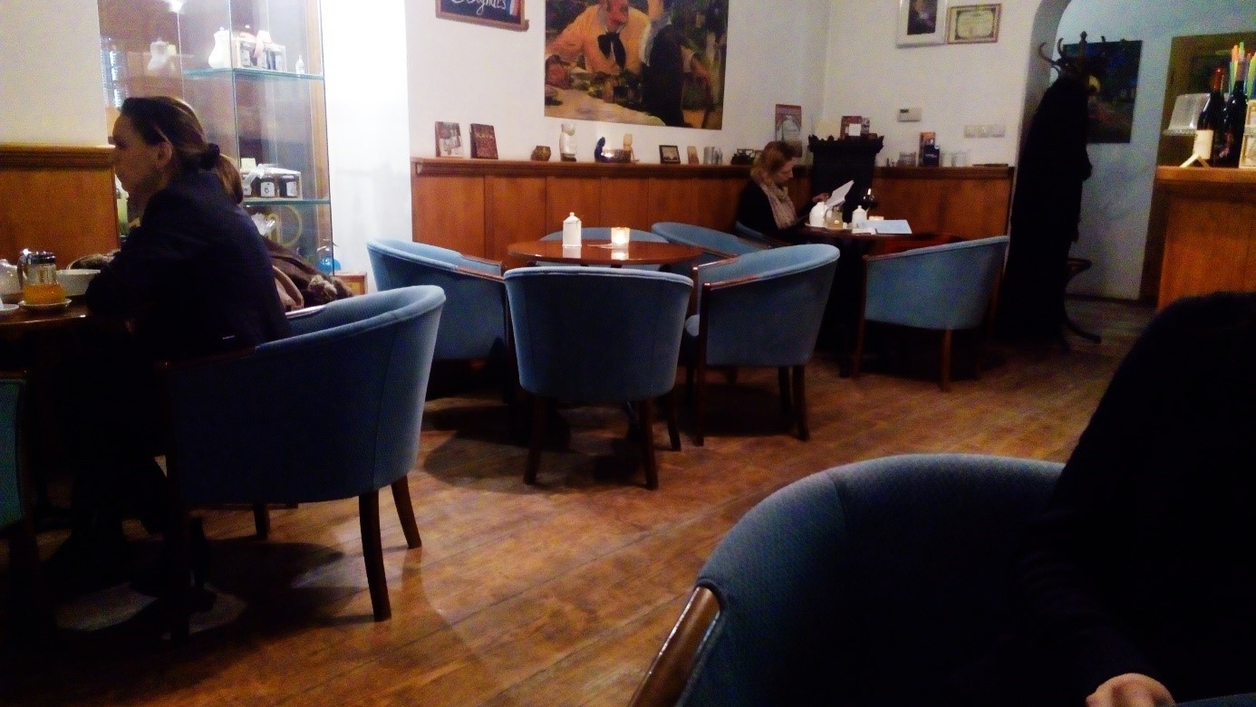 Interiér sa nesie vo vintage duchu a spája francúzsku eleganciu so skromnosťou malej kaviarne. Dobová atmosféra je zaistená rustikálnymi kúskami nábytku a hlavne maľovaným stropom. Mňa osobne najviac uchvátila nádherná drevená podlaha. Dominancia hnedého dreva je oživená akcentom modrých poťahov na kreslách. Obrazy na stenách pôsobia kompaktne so zvyškom interiéru, no odporúčal by som ich zarámovať. Je to priestor pre klasikov – dotyk 20. rokov, teplé tlmené osvetlenie, jemný jazz v rádiu… Je to tu veľmi útulné. Kaviareň ponúka súkromie, pokoj a vďaka svojmu dobovému rázu aj romantiku. Som veľmi rád, že dokázali využiť atmosféru à la France bez bezpodmienečného kopírovania provensálskeho vidieku (t.j. samá biela a levanduľová), ako to tak často vidíme.