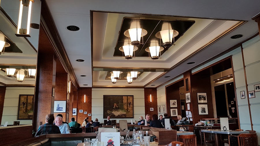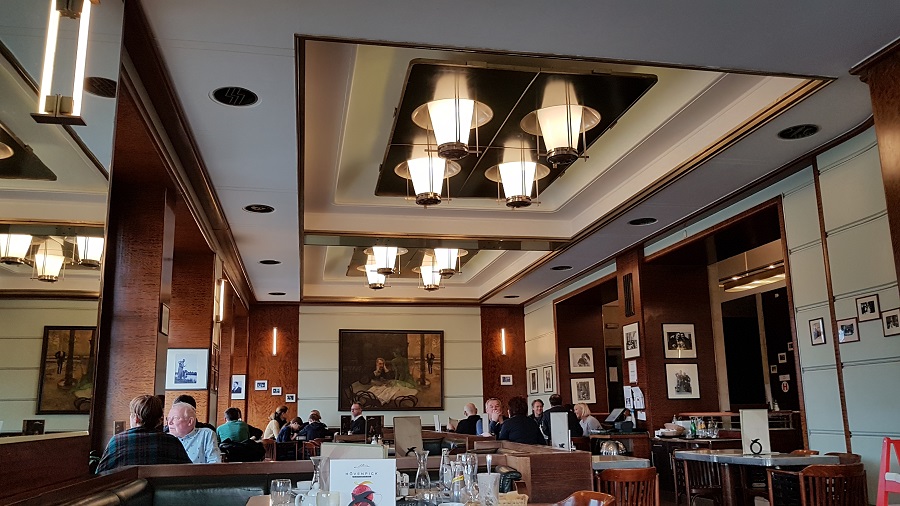 Veľmi oceňujem, že pri vstupe do kaviarničky vám odložia veci v šatni. Sedieť v kaviarni Slávia v človeku vyvoláva nostalgiu. Máte pocit, že sa čas vrátil do minulého storočia. Musím sa priznať, že som mala husiu kožu, keď som sa pozerala okolo seba. Cez obrovské okná do priestoru preniká dostatočné svetlo. Za prvej republiky sa Slavia premenila na kaviareň v štýle francúzskeho art deco. Podobne ju poznáme aj dnes s drevom a mramorom na stenách a s množstvom zrkadiel. Za nápaditý prvok považujem moderné riešenie stropu so svietidlami. V miestnosti sa nachádzajú útulné boxy aj typické okrúhle mramorové stolíky. Každý z významných hostí tu má svoju fotografiu. Pôvodný obraz Slavie putoval do galérie a bol nahradený obrazom Pijáka absintu od Viktora Olivu. Tento veľký a pôsobivý obraz vyobrazuje pijana a zelenú éterickú vílu. Spomínaný maľovaný výjav nájdete aj na ponukovom lístku.