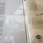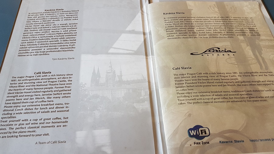 Jedálny lístok bol položený priamo na stoloch, v ponuke nechýba česká, ale ani medzinárodná kuchyňa. Samozrejmosťou sú raňajky, ale aj mäsové špeciality, ryby, šaláty. Kaviareň Slavia ponúka exkluzívnu bio kávu CAFÉ VERDE od spoločnosti J.J.Darboven. Spomínaná značka je vhodná aj pre náročných klientov. J.J.Darboven bola založená v roku 1866 v Nemecku, a to konkrétne v Hamburgu. Spoločnosť J.J.Darboven sa stotožňuje s myšlienkou udržiavania životného prostredia. CAFÉ VERDE obsahuje ručne zbierané a triedené kávové zrná z kontrolovaných ekologických plantáží. Čašníci nám nechali dostatok času, aby sme si mohli vybrať z danej ponuky. Obsluha bola zhovorčivá a galantná a veľmi vhodne oblečená. My sme si objednali cappuccino, ktoré bolo mimoriadne chutné. Priamo od stola so šálkou kvalitnej kávy v dlaniach sme pozorovali nábrežie Vltavy, Karlov most, Pražský hrad alebo Národné divadlo. Kaviareň Slávia by nám vedela vyrozprávať nejeden zaujímavý príbeh.