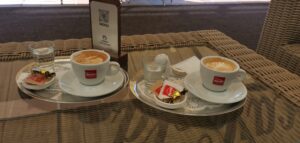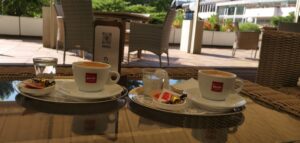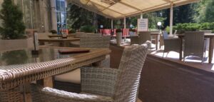 Už pri prvom kroku do kaviarne nás privítala atmosféra, ktorá dýchala eleganciou a komfortom. Interiér bol starostlivo navrhnutý tak, aby každý detail prispieval k pocitu útulnosti a uvoľnenia. Dominovali mu pohodlné červené kreslá, ktoré nielenže poskytovali maximálne pohodlie, ale zároveň dodávali priestoru nádych klasického štýlu. Tieto kreslá boli doplnené mäkkými vankúšmi, ktoré pôsobili pozývavo a lákali na dlhšie posedenie. Tradičný barový pult bol srdcom kaviarne, kde sa sústreďovala energia celého priestoru. Jeho drevené detaily a starostlivo usporiadané nápoje a pochutiny len podčiarkovali prívetivú atmosféru miesta. Veľké okná, ktoré lemovali steny kaviarne, vpúšťali dnu dostatok prirodzeného svetla, ktoré jemne ožarovalo každý kút. Toto svetlo v kombinácii s príjemnou farebnou paletou interiéru ešte viac umocňovalo pocit pohodlia a relaxácie, ktorý sa dal v tejto kaviarni zažiť. V letných mesiacoch sa atmosféra kaviarne rozširuje aj na vonkajšiu terasu, ktorá je ako stvorená pre tých, ktorí radi trávia čas vonku. Terasa je prekrytá veľkou markízou, ktorá poskytuje dostatočnú ochranu pred slnkom a zároveň umožňuje vychutnať si čerstvý vzduch. Prútené stoličky a stoly vytvárajú príjemné prostredie, kde sa môžete pohodlne usadiť a užívať si popoludňajší oddych. Celá terasa je obklopená zelenými stromami a nádhernými kvetinovými záhonmi, ktoré ešte viac umocňujú pocit spojenia s prírodou.