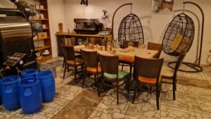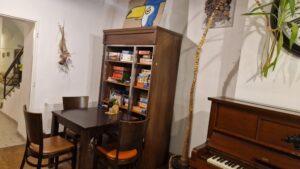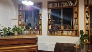 Interiér tejto kaviarne je zariadený s veľkým citom pre detail. Kombinácia drevených stolov a stoličiek dodáva priestoru nádych rustikálnej jednoduchosti, zatiaľ čo starý klavír, ktorý stojí v jednej z miestností, pripomína časy dávno minulé. Klavír však nie je len dekoráciou – slúži aj na príležitostné koncerty, ktoré sa tu konajú. Hneď vedľa klavíra nájdete vysokú policu plnú stolových hier a kníh. Tento malý raj pre milovníkov kníh a hier vytvára ideálnu príležitosť stráviť popoludnie s priateľmi či rodinou pri partii šachu alebo čítaní zaujímavej knihy. Je to miesto, kde sa spája pohodlie s kreativitou, kde čas plynie pomalšie a kde sa cítite ako doma. Kaviareň je rozdelená do viacerých priestorov – každá miestnosť má svoje čaro. Niektoré časti majú vysoké klenbové stropy, ktoré dodávajú priestoru vzdušnosť a historickú eleganciu. Celý interiér je navyše doplnený živými rastlinami a jemným osvetlením, čo vytvára príjemnú útulnú atmosféru. Kaviarne nie sú len o dobrom nápoji, ale aj o prostredí, kde si ho vychutnávate – a toto miesto to zvláda na jednotku.