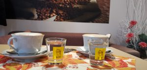 Príjemná a ochotná čašníčka nám priniesla pútavý nápojový lístok. Objednali sme si veľké cappuccino v hodnote 2,10€. Ku cappuccinu sme dostali pohár vody. V tejto kaviarni servírujú kávu značky Lavazza. Táto značka kávy nie je síce pre mňa to pravé orechové, ale vzhľadom na to, že sme si dali veľké cappuccino, bolo celkom chutné, pretože ho väčšia porcia mlieka zjemnila. V minulosti, keď sme boli v tejto kaviarni, ku káve podávali trojuholník z kúpeľnej oplátky, to mi prišlo veľmi výstižné, keďže sa nachádzame v kúpeľnom mestečku. No v dnešnej dobe už ku káve túto milú pozornosť neservírujú, čo je veľká škoda. Musím poznamenať, že kaviareň od našej poslednej návštevy aj mierne zmenila svoj dizajn. V kaviarni majú na predaj široký výber kúpeľných oplátok s rôznou príchuťou. V ponuke majú okrem kávových nápojov, ktoré vám pripravia aj v bezkofeínovej variante, taktiež varené víno, horúcu limonádu, punč, horúcu čokoládu, čaj. Tieto teplé nápoje zákazníci ocenia predovšetkým v zimných mesiacoch. V lete uprednostnia limonády, miešané nápoje, pivo, víno a taktiež alkoholické a nealkoholické nápoje. Chladnička bola v čase našej prítomnosti takmer prázdna. To považujem za nedostatok, pretože ako každý dobre vie: „Jeme aj očami.“ Vzhľadom na názov by som od kaviarne čakala viac viedenského šmrncu, chýbala mi napríklad Sacherova torta. Ale v konečnom dôsledku, táto zašitá kaviarnička v Alexander centre je vcelku milá.