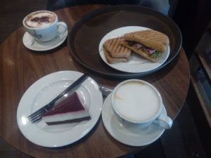 Rozhodli sme sa vyskúšať kávu stredné Capuccino ,strednú horúcu čokoládu, taliansky sendvič a ovocno smotanový koláč.