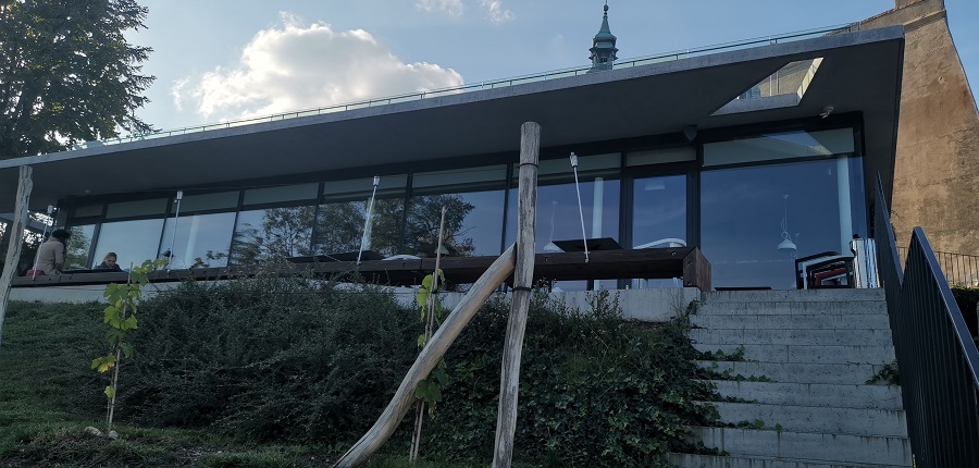 Ako som sa dočítala, kaviareň dalo postaviť Nitrianske biskupstvo za pomoci Nórskych fondov. Objekt už počas výstavby vyvolal horlivú debatu o tom, či patrí na takéto historické miesto. Samozrejme, že názory sa rôznia. No ja som jednoznačne za. Castellum Cafe neruší výhľad na hrad a skvelo splýva s okolím. Podnik je celý zapustený do hradnej skaly a keď vyšliapete ku hradbám, ani si ho nevšimnete, pretože budete stáť na jeho streche. Vedľa strechy je schodište, ktorým pohodlne zídete priamo na terasu kaviarne.