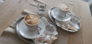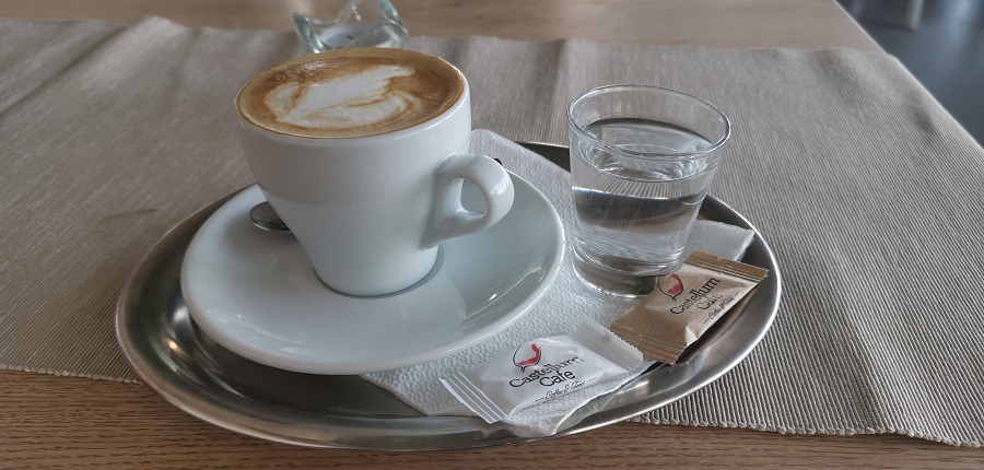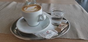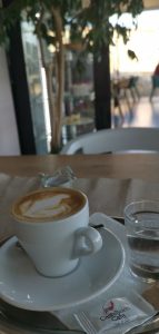 Keď sme sa posadili hodnú chvíľku trvalo, než nás prišli obslúžiť a taktiež celý následný servis trval dlhšie. Ale vzhľadom k tomu, že kaviareň bola plná, tak to bolo pre nás pochopiteľné a akceptovateľné. V kaviarni pripravujú domáce limonády, teplé nápoje, denné menu, rôzne špeciality, dokonca si sami pečú dezerty. Objednali sme si cappuccino v hodnote 1,90€. Káva bola servírovaná v bielej šálke s pohárikom vody. Cappuccino by som označila za celkom chutné.