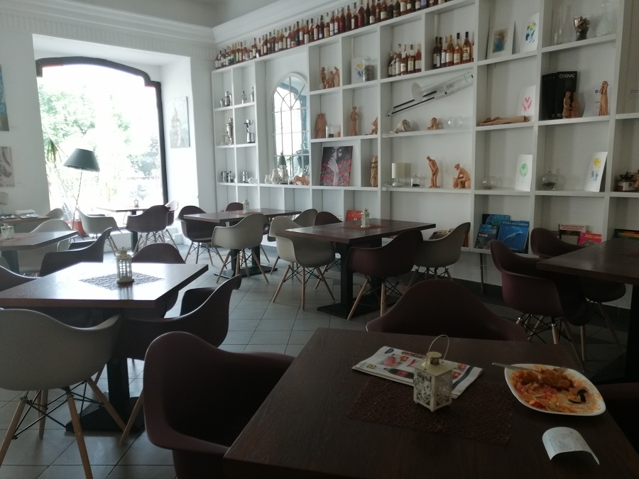 Prostredie kaviarne je kúzelné. Môžete sedieť dnu alebo aj vonku. Ak sedíte dnu, tak na vás dýcha pokoj a pohoda. Biele doplnky, jemné odtiene farieb, moderne zariadené. Ak naopak sedíte vonku, tak tam máte mestský frmol. Sedíte na pešej zóne, pri najväčšej pamiatke Košíc a teda pri Dóme sv. Alžbety. Takže musíte rátať s turistami, ľuďmi, no aj s bezdomovcami, ktorí tu radi žobrú. Ale napriek tomu je tam krásne prostredie a ja si tam rada posedím.