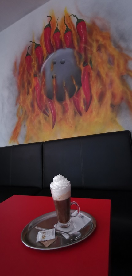 Hneď, ako sa vyriešila „bowlingová problematika“, milá pani čašníčka nám priniesla ponukový lístok. Bola som veľmi milo prekvapená, že ponúkajú široký výber káv, koktailov, pív, nealkoholických a alkoholických nápojov. Pre odvážlivcov majú v ponuke aj svoju špecialitu v podobe Espresso corretto chilli, kde okrem kávy a alkoholu zacítite jemný závan chuti chilli papričiek. Ako sa človek môže dovtípiť, už z názvu ich prevádzky je zrejmé, že sa zameriavajú predovšetkým na rumy, ktorých nájdete v ich ponuke vyše 180 druhov. V Chilli caffe bowling & rum bar majú originálnu rumotéku, kde sa môžete pohodlne usadiť do kožených kresiel a nechať sa unášať úžasnou karibskou atmosférou. Objednali sme si nejaké nealkoholické nápoje, limonádu, čokoládu so šľahačkou a cappuccino. Na moje veľké počudovanie, cappuccino v Chilli caffe bolo výborné. Poteší aj fakt, že cappuccino má veľmi priaznivú cenu 1,60€. Kávu, ktorú majú v ponuke, je značky ORO Caffé. Značka ORO Caffé sa zrodila v roku 1972. O 15 rokov neskôr, v roku 1987 firmu prevzali Chiara a Stefano Toppano.  Vďaka nadšeniu sa rodine podarilo firmu premeniť z malej pražiarne kávy na veľkého hráča na talianskom, ale aj medzinárodnom trhu s kávou. Cappuccino by svojou chuťou vedelo konkurovať nejednej mestskej kaviarničke.
