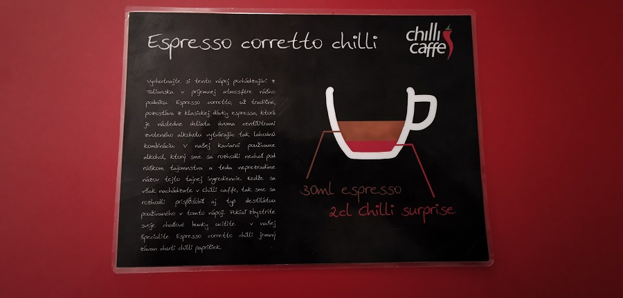 Chilli caffe sa z môjho pohľadu nesie v retro štýle. Dominantnou farbou tohto podniku je bezpochyby červená, ktorá je pre chilli príznačná. Za nápadný prvok považujem barový pult, ktorý je doslova preplnený fľašami s alkoholom. Páčia sa mi tematické kresby, ktorými sú pomaľované steny. Oceňujem, že podnik disponuje aj príjemnou terasou. Chilli caffe je vhodné miesto pre firemné akcie, večierky či rodinné oslavy. Vo svojich priestoroch vedia usporiadať malú oslavu pre 8 ľudí, ale taktiež aj väčšiu udalosť s účasťou okolo 60 hostí. Kaviareň v konečnom dôsledku pôsobí pohodovo. Keď počas chladných dní nebudeme vedieť, kam sa vybrať, určite zájdeme na bowling do Chilli caffe bowling & rum bar. A s určitosťou môžem povedať, že nepohrdnem ani ich vynikajúcou kávou.