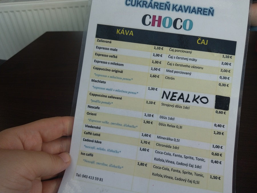 Ceny sú tam rovnaké ako všade inde, takže mňa Café Latte vyšlo na 1,70 e. Čo je absolútne bežné, musíte uznať isto aj vy. A ostatné kávy tiež neboli drahšie. Tu sa dostávame k ponuke…