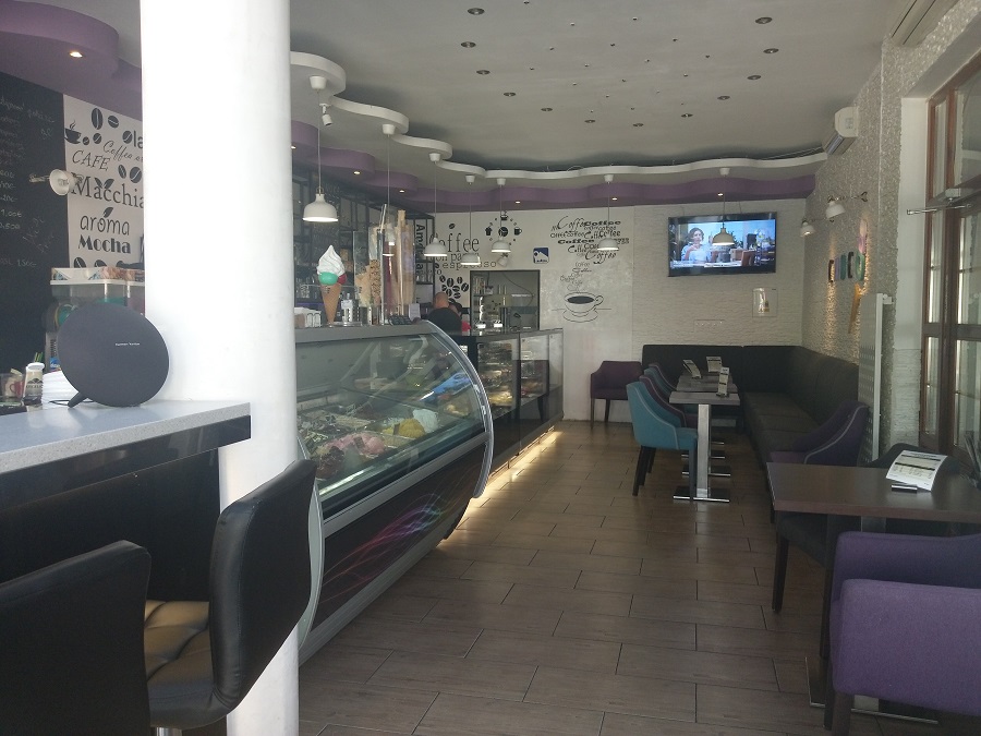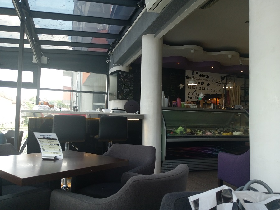 Prostredie kaviarne je mne veľmi sympatické. Prevažne fialová farba si ma získala. A sú tam jemné, šedé doplnky, takže aj to je veľmi kladné. A čo sa týka zariadenia, tak to je pomerne moderné. Majú aj terasu, takže máte prehľad, ak chcete, čo sa deje vonku. Je to aj pre rodiny s deťmi, keďže je dosť priestorná. Ale blízko je cesta, takže pozor na to. Rodiny to vyhľadávajú kvôli super zmrzline, kde sú aj netradičné príchute ako slaný karamel a podobne.
