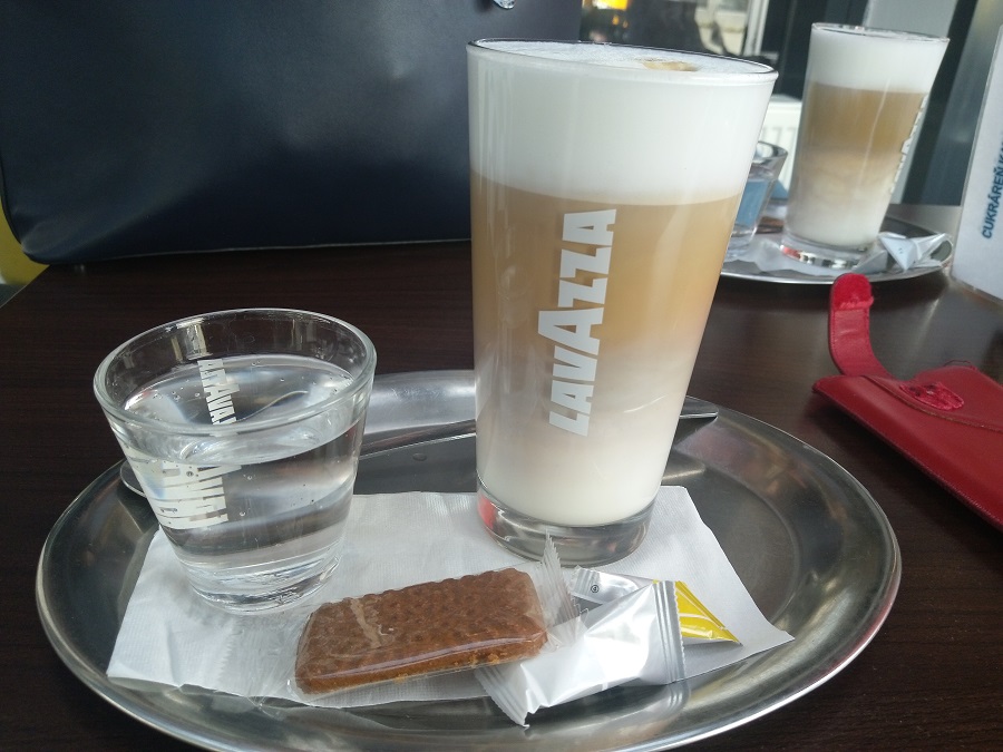 Káva bola tiež veľmi dobrá. Neviem ako to spravili, aj toto bola moja prvá káva, resp. prvé latté, ktoré bolo vriace a musela som počkať, kým ho môžem začať piť. Bolo super vyšľahané. Museli ste si slamku vypýtať, ale to je detail. Mali ste k dispozícii cukre (obidva druhy), vodu – minerálku a keksík. A chuť? Bola naozaj dosť silná, na to, že to bolo obyčajné Latte.