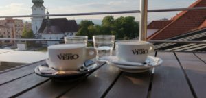V City Caffe sa môžete skvelo zabaviť napríklad aj počas tematických večerov. Personál starostlivo vyberá toho správneho interpreta, DJ-a taktiež témy večernej zábavy. City Caffe si zakladá na kvalitné značky, o čom svedčí aj ich nápojový lístok. V kaviarni majú v ponuke samozrejme kávu, všetky kávy vedia pripraviť aj v bezkofeínovej verzii. Kávu pripravujú talianskej značky Caffé Vero. Spoločnosť Caffé Vero bola založená niekedy na začiatku 90. rokov vďaka vízii rodiny Vicente Franchetto, ktorá priniesla svetu jednu z talianskych slávnych tradícií: Talianske ESPRESSO. Firma sa nachádza v severnom meste Vicenza. Jedným z tajomstiev tejto firmy pre vysokokvalitnú a jedinečnú produkciu je dokonalá rovnováha medzi zručnosťou a aplikáciou najnovších technológií. Samozrejme, dôležitý je výber najlepších kávových zŕn a neustále sledovanie v laboratóriách zabezpečuje, aby surovina bola v dokonalej v kvalite. Taktiež ponúkajú skvelú horúcu čokoládu kvalitnej slovenskej značky LYRA, ktorá je ručne vyrábaná z kakaa Fino de Aroma, ktorú si sami spracujú od oberania zo stromov až po praženie a výrobu kakaovej hmoty. Fino de Aroma sa pestuje predovšetkým v Kolumbii, Peru, Ekvádore a Venezuele. Široká ponuka je obohatená o nealkoholické nápoje, z ktorých vám personál veľmi rád ponúkne FENTIMANS. Jedná sa o prírodný bylinný nápoj vynikajúcej kvality s viac ako 100-ročnou tradíciou. Obsahuje len prírodné zložky od špecializovaných dodávateľov. Ak však máte chuť na niečo ostrejšie, vyskúšajte FENTIMANS GINGER BEER, ktorý sa vyrába podľa originálneho receptu – korene zázvoru sa pomelú sa následne sa vložia do medenej parnej kade a nechajú sa povariť, pričom sa uvoľní ich aróma. Nakoniec sa pridajú rôzne bylinky a prírodné arómy. V ponuke nesmie chýbať: Pivo, Víno, Šampanské, Whisky, Rum, Gin, Brandy, Vodka, Tequila, Destiláty, Vermuty, Likéry a samozrejme Koktaily od výmyslu sveta, o čom napokon vypovedá aj samotný názov podniku. Na pochutenie si môžete dať zákusky, pannini, slané pochutiny a aj zmrzlinu. Z danej špičkovej ponuky sme nakoniec neodolali cappuccinu v hodnote 2€. Káva bola servírovaná v bielej šálke s logom spoločnosti Caffé Vero. Ku kávičke nám priniesli pohár vody, cukor a malú sladkosť. Káva bola výborná a výhľad z letnej terasy bol jednoducho neopísateľne krásny.