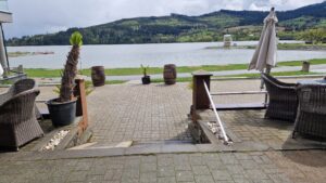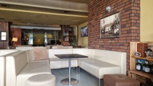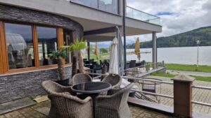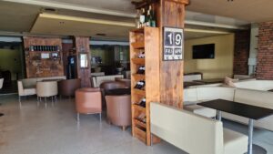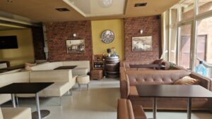 Interiér Cocktail Baru v Námestove je starostlivo navrhnutý, pozostáva z viacerých miestností a každá z nich vytvára jedinečný, no konzistentný pocit útulnosti a štýlu. Priestory sú ladené do príjemného a elegantného štýlu, pričom sú rozdelené do rôznych sedacích zón, čo umožňuje návštevníkom vybrať si miesto podľa svojej nálady či potreby súkromia. Pohodlné kožené pohovky a kreslá v neutrálnych tónoch sú rozmiestnené okolo nízkych stolov a vytvárajú ideálne prostredie pre relax či priateľské posedenie. Interiér dopĺňajú detaily ako veľký vintage hodinový ciferník a historické fotografie na stenách, ktoré pridávajú priestoru elegantný nádych a jemnú dávku nostalgie. Jeden z rohov je ozdobený dreveným sudom a malou poličkou s fľašami, čo vytvára príjemnú a neformálnu atmosféru. Jemné lampy s tlmeným svetlom osvetľujú priestory a dodávajú im pokojné pohodové prostredie. Na stenách nájdete aj logo baru a regál so zásobou vína, čo priestoru pridáva pocit exkluzivity. Exteriér baru je vybavený modernou terasou, ktorá ponúka štýlové a pohodlné sedenie s prútenými kreslami a sklenenými stolmi. Veľké slnečníky poskytujú príjemný tieň a návštevníci si tak môžu vychutnať pohodlie posedenia vonku aj počas slnečných dní. Najväčším lákadlom terasy je však výhľad na Oravskú priehradu a okolitú prírodu – pohľad na pokojnú vodnú hladinu s okolitými lesmi a svahmi v diaľke je ideálnym prostredím na relax. Palma umiestnená na terase dodáva exotický nádych, zatiaľ čo kamenná fasáda baru kontrastuje s prírodným okolím a dodáva celému priestoru harmonickú rovnováhu. Vnútorný aj vonkajší priestor Cocktail Baru sú vytvorené tak, aby ponúkli dokonalé miesto pre oddych pri nápoji či káve. Tento bar predstavuje oázu pokoja s nádhernými výhľadmi, kde si hostia môžu oddýchnuť a načerpať energiu, obklopení krásou Oravy a pohľadom na Oravskú priehradu.