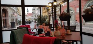 Sklená terasa je oázou pokoja, kde môžete na chvíľu uniknúť od ruchu mesta a ponoriť sa do sveta sladkých pôžitkov. Terasa je starostlivo zariadená, obklopená zeleňou a kvetmi, ktoré vytvárajú útulné a harmonické prostredie. Presklenie poskytuje nielen ochranu pred nepriaznivým počasím, ale aj krásny výhľad na historickú architektúru mesta, ktorá dodáva vášmu zážitku jedinečný rozmer. Vstup do cukrárne je označený elegantnou tabuľou, ktorá už z diaľky pozýva návštevníkov dovnútra. Po prekročení prahu vás okamžite pohltí príjemná atmosféra interiéru, ktorý je kombináciou historického šarmu a moderného pohodlia. Tehlové klenby dodávajú miestnosti rustikálny nádych, zatiaľ čo moderné nábytkové prvky a dekorácie vytvárajú komfortné prostredie na posedenie. Stoly sú starostlivo usporiadané, doplnené o kvety a jemné osvetlenie, ktoré umocňuje romantickú atmosféru tohto miesta.