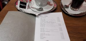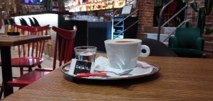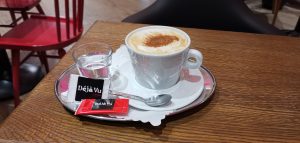 Tentokrát sme Déjà Vu Coffee navštívili v zime, takže sa nám žiadalo zahriať sa šálkou horúcej kávy. Teda kávu som si objednala len ja, ostatní si dožičili varené vínko. Konkrétne som si objednala veľké cappuccino v hodnote 2€. Kávu servírujú značky CAFÉ RESERVA. Pravdupovediac, s touto značkou som sa stretla po prvýkrát. Takže som „naštartovala“ Google a zisťovala som, o akú kávičku sa jedná. A dočítala som sa niečo v tomto znení: Jedinečný koncept prémiových kávových zmesí CAFÉ RESERVA vytvorili spoločne s ikonou talianskej kávy pánom Gian Luigi Norou, majstrom v danej oblasti. Tieto prémiové kávové zmesi certifikované Rainforest Alliance sú pražené v Taliansku pod dohľadom pána Gian Luigi Nory, viceprezidenta talianskej kávovej spoločnosti, ambasádora Cafe de Brasil a najmä uznávaného milovníka a znalca kávy. Výsledkom tohto procesu je unikátna chuť a vôňa kávy CAFÉ RESERVA – 100% RAINFOREST. Chuť kávy CAFÉ RESERVA je výnimočná preto, lebo zrná kávy pochádzajú z malých plantáží v Afrike, Indii, Strednej a Južnej Amerike. Všetky ich dodávateľské farmy sú držiteľmi certifikátu Rainforest Alliance Certified™.  Kávovníky na týchto farmách tak rastú prirodzene v tieni dažďových pralesov. Káva sa tu pestuje bez použitia chemických hnojív, umelých pesticídov alebo herbicídov. Tieto pestovateľské postupy dopomáhajú udržiavať zdravé životné prostredie a taktiež prispievajú k ochrane čistej podzemnej vody. Takže som bola milo prekvapená, akú kvalitnú kávu v kaviarni Déjà Vu podávajú. Vzhľadom k tomu sa mi cena za kávu zdá prijateľná. Kávu vám na požiadanie pripravia aj v bezkofeínovej variante. Keď sa pozriete za barový pult, uvidíte, že táto kaviareň má v ponuke široký výber rôznych destilátov. V ponuke majú alkoholické a nealkoholické nápoje, limonády, kokteily a veľa iného. Čašníčka, ktorá nás obsluhovala, bola veľmi ochotná a milá.