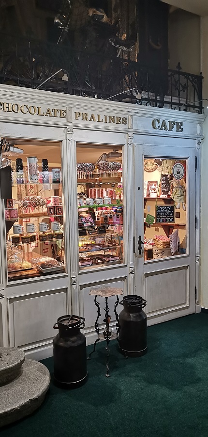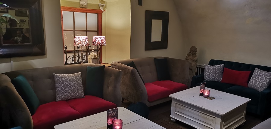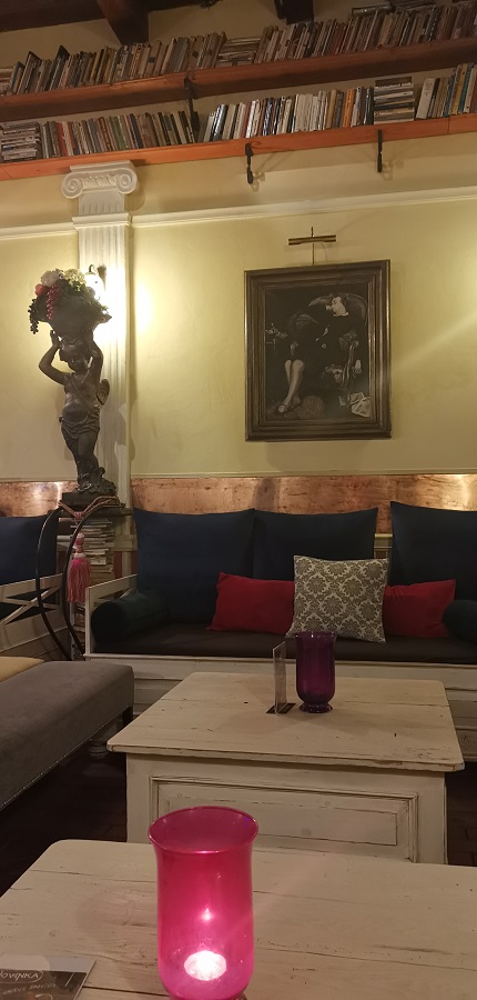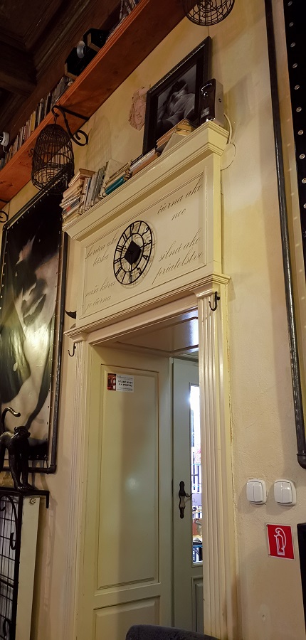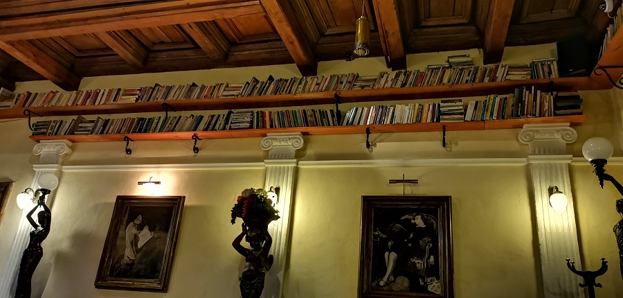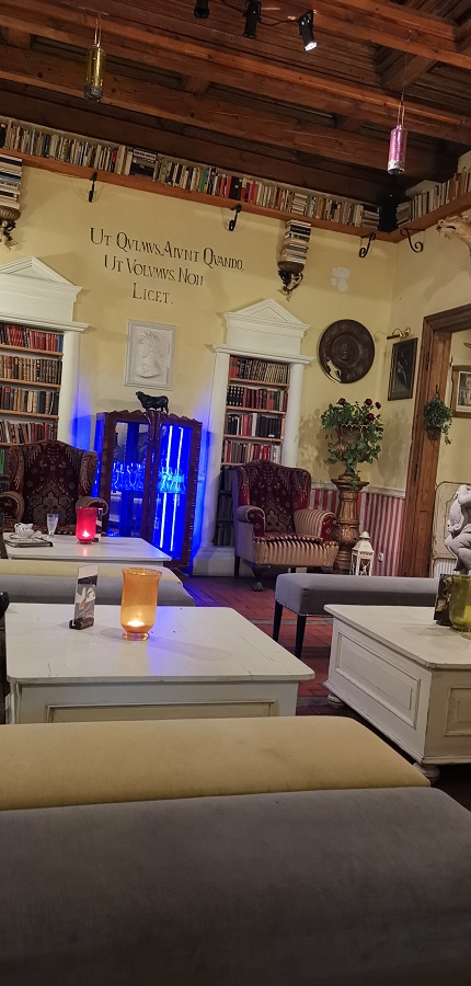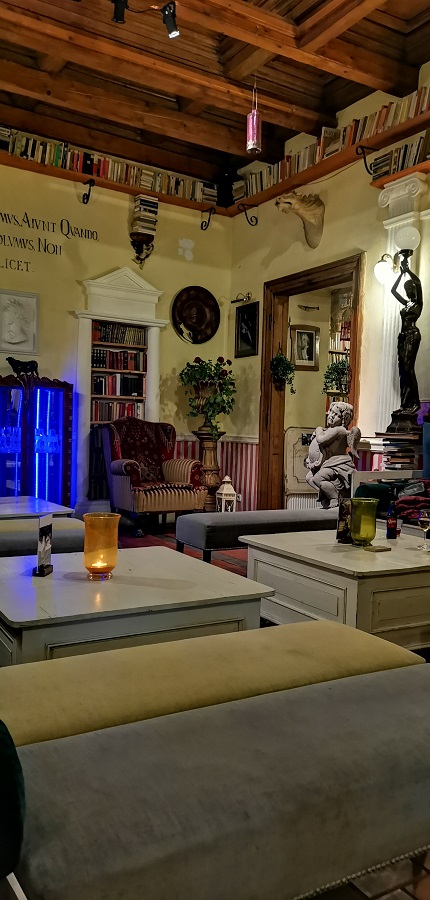 Strácam pojem o čase a neverím vlastným očiam. Ako milovníčka kníh veľmi oceňujem bohatú knižnú zbierku. Svetlo je tlmené – romantické, sedenie v šedej farbe s kopou farebných vankúšikov a s dominantným bielym dreveným stolom je veľmi pohodlné. V miestnosti sa nachádza všetko možné, na čo si človek spomenie, vázy s kvetmi, sochy, obrazy, lampičky, lampáše, kreslá, tapety, sviečky, prekrásny drevený strop. Projektor na stene prehráva video a v pozadí hrá príjemná hudba. Tajuplne na mňa pôsobí tiež predstava, že sa nachádzam v priestoroch bývalej krajčírskej dielne. Koľko rôznych životných príbehov sa tu odohralo?