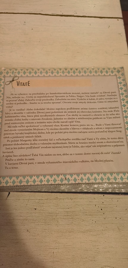 Nakoniec som sa rozhodla pre miestnosť, ktorá bola podľa môjho názoru najkrajšia. Nakoľko bola už pokročilá hodina, ľudí bolo v kaviarni pomenej, až človek nadobudol pocit, že má kaviareň sám pre seba. Konečne som si sadla, o chvíľku prichádza čašník, na moment som nevedela, čo mi to nesie, či to je nápojový lístok alebo nejaká kniha. Uznávam, že Divná pani sa vyhrala s ponukovým lístkom nie len jeho dizajnom, ale aj širokou ponukou. Musím podotknúť, že ceny sú trošku vyššie, ale určite primerané tomu, čo táto kaviareň ponúka.