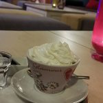 Moje myšlienky preruší čašník s otázkou, čo som si vybrala. Objednávam si cappuccino so šľahačkou. No kto by už len vedel odolať čerstvo zomletej talianskej káve? Káva bola veľmi dobrá, ale sklamala ma sladká šľahačka, tešila som sa na čerstvú nesladenú domácu šľahačku. Cappuccino bolo servírovane v krásnej rúžovej šálke, na klasickej striebornej tácke s pohárom vody.