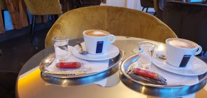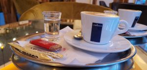 Počas našej návštevy bola kaviareň úplne prázdna, takže núdzu o voľné miesto a súkromie sme rozhodne nemali. Má to však aj malú nevýhodu, pretože sa cítite ako „ostro sledované vlaky“ zo strany personálu. Samozrejme, že to nemyslím v zlom, ale vzhľadom na to, že sme tam boli len my, čašníčka sa chcela uistiť, že nám nič nechýba a nič nepotrebujeme. Preto jej pohľady k nášmu stolu boli pomerne časté. Trošku ma prekvapilo, že nám čašníčka nepriniesla ponukový lístok a keď som si ponuku vypýtala, tak mi povedala, že žiadny nemajú. Tak sme vsadili na klasiku a objednali sme si cappuccino. Kávu pripravujú talianskej značky Lavazza. História kávy Lavazza sa začala písať už v roku 1894, kedy Luigi Lavazza v starej časti Turína založil svoj vlastný obchod. Spoločnosť s názvom Lavazza bola založená v roku 1895. Dnes je Lavazza veľkým hráčom na kávovom trhu a nielen v Taliansku. Cappuccino malo aj veľmi prijateľnú cenu 1,60€. Tu však musím vyzdvihnúť veľmi dobrú chuť cappuccina aj napriek tomu, že používajú pre mňa menej obľúbenú Lavazzu. Pretože ma ich ponuka zaujímala, tak som si ju vyhľadala ako inak, než na internete. A musím uznať, že ich ponuka je celkom široká. V ponuke majú veľký výber káv, ktoré vedia pripraviť aj bez kofeínu. Prekvapilo ma, že majú v ponuke aj cibetkovú kávu alebo detskú kávičku. Pripravujú rôzne teplé nápoje, ľadové nápoje, nealkoholické nápoje, likéry, destiláty, pivo, víno, ale taktiež rôzne dezerty, zmrzlinu Glacio. Personál v tejto prevádzke bol veľmi milý. V kaviarni Espresso pod Lipou som síce bola prvýkrát, ale určite nie naposledy.