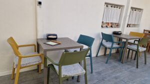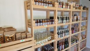 Po prehliadke farmy sme zamierili do ich obchodíka, ktorý bol zariadený v krásnom rustikálnom štýle. Interiér bol útulný, plný drevených prvkov a poličiek naložených rôznymi produktmi, ako sú medy, džemy, čerstvé syry a ďalšie farmárske špeciality. Atmosféra bola teplá a domácka, čo umocňovalo celkový zážitok z návštevy. Exteriér obchodíku sa niesol v podobnom duchu ako celá farma – drevené konštrukcie a príjemné sedenie na terase, kde sme si mohli oddýchnuť a užiť si občerstvenie. Terasa bola zariadená pohodlnými pohovkami a stolmi, kde sa rodiny mohli pohodlne usadiť a vychutnať si chvíľku pokoja po aktívnej prehliadke farmy.