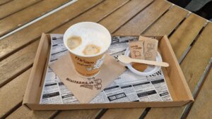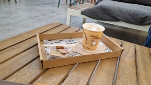 Po usadení sa na terase sme si objednali cappuccino, ktoré bolo podávané veľmi štýlovo. Káva nám bola naservírovaná v krásnom papierovom poháriku s nápisom „Mňam mňam“, ktorý bol doplnený o rustikálny táckový podklad s novinovým dizajnom. Cappuccino bolo doplnené drevenou lyžičkou a malým sladkým keksíkom – detail, ktorý urobil tento zážitok ešte príjemnejším. Servírovaná značka kávy bola „Coffee Sheep“. Táto značka pochádza z pražiarne v Trenčíne, ktorá vznikla v roku 2011. Kladie dôraz na čerstvosť a kvalitu kávových zŕn a stala sa obľúbenou pre svoj prírodný a ekologický prístup. Káva bola jemná a krémová s bohatou chuťou a dokonale vyváženým pomerom medzi mliekom a espressom. Počas celej návštevy sme si skutočne užili nielen prostredie farmy, ale aj kulinárske zážitky. Čo však dodalo celému zážitku ďalší rozmer, bola obsluha. Personál farmy aj obchodíka bol milý, usmievavý a ochotný odpovedať na všetky naše otázky. Naša návšteva minifarmy Lubina bola príjemným zážitkom. Okrem kontaktu so zvieratkami, ktoré potešili deti aj dospelých, sme si užili chvíle pokoja v krásnom prostredí farmy. Zastávka v obchodíku nám umožnila ochutnať miestne produkty a lahodnú kávu, ktorá nás príjemne prekvapila svojou kvalitou. FarmaPARK Lubina je skvelým miestom pre rodinný výlet, kde môžete nielen spoznať zvieratká, ale aj vychutnať si chvíle v prírode s chutným občerstvením.