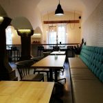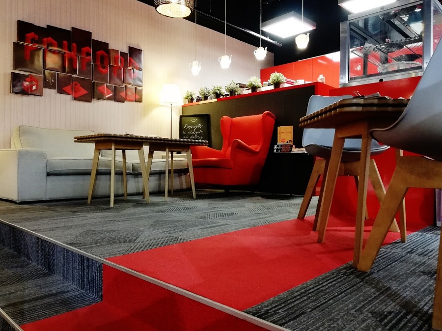 Červená je farbou lásky, no taktiež aj agresivity a tak je jej výber veľkým riskom. Dokáže surovo zavraždiť potenciál mnohých interiérov a vnesie mu vulgárny ráz – to však nie je prípad Foxfordu. Nájdeme tu spojenie dizajnových a infantilných kúskov, ktoré spolu prekvapivo vytvárajú útulne hniezdočko, kde sa človek môže schúliť s knižkou v ruke. Za najštýlovejší prvok považujem skladanú podlahu zloženú z kosodĺžnikov troch rôznych driev. Pod spomínané infantilné detaily by som zaradil nožičky od stolov v tvare červených ceruziek, čajníkové lampy alebo konferenčný stôl, ktorý pripomína sušienku. Foxford vie ako na deťúrence! Príjemný interiér je doladený zopár retro sedačkami, ktoré bijú na škandinávsku nôtu a nesú sa v spomínanej červenej farbe. Zaujímavým detailom, ktorý stojí za spomenutie, sú stoly so sklenenou doskou. Pod ňou sú naukladané otvorené knižné bestsellery ako Pán Prsteňov či Harry Potter.