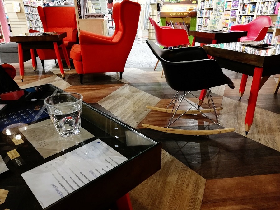 To, čo narúša kúzelný dojem, je fakt, že kaviareň sa nachádza priamo v predajni a tak pri pohľade vôkol vidíme celý rad rôznofarebných a chaotických artiklov.