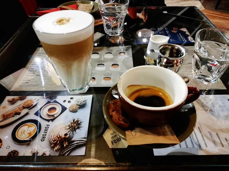 V ten deň sme si dali espresso lungo s karamelovým latté. Na espresso som sa obzvlášť tešil, keďže jeho intenzívna, no lahodná chuť je zárukou toho, prečo sa do Foxfordu tak rád vraciam. Dnes ma však sklamalo – bolo viac vodnaté, menej intenzívne a pomerne studené. Možno by sa hodilo trochu ohriať mliečko. Karamelové latté bolo vskutku podarené – príjemne osladené s decentnou arómou. Deň väčšinou napraví malý škoricový koláčik s brusnicami, no dokonca aj ten bol počas našej návštevy obschnutý. Napriek tomu sme ho zhltli v priebehu sekundy.