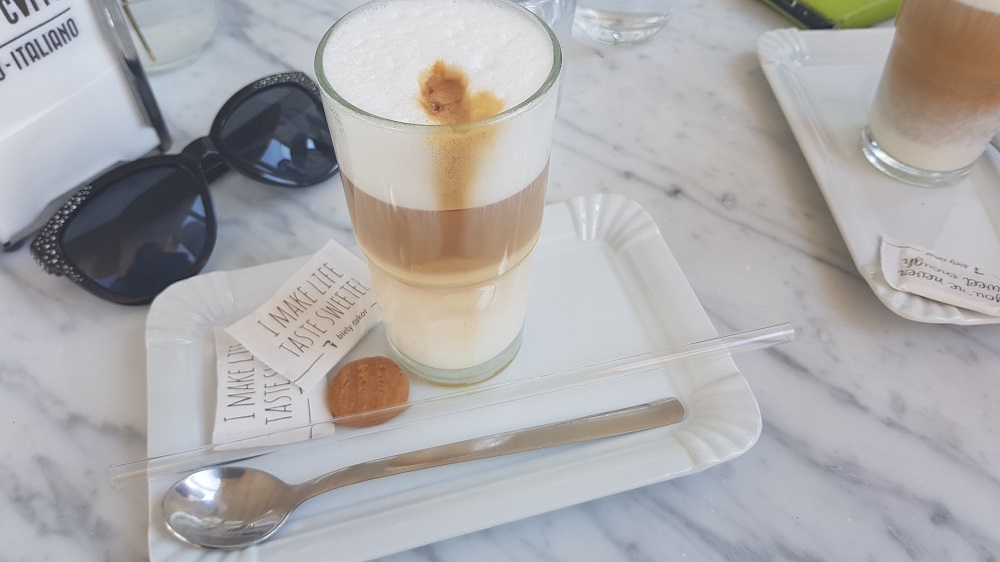 Veľmi rýchlo prišla ku mne obsluha a veľmi rýchlo mi doniesla aj moju objednávku. Dala som si latta macciato, k nemu som dostala hnedý a biely cukor a samozrejme aj pohár vody a to bez opýtania. Kávu som dostala na sklenenej tácke a aj so sklenenou slamkou čo som bola veľmi prekvapená, že takého slamky niekde dávajú. Pena bola výborne našľahaná, sladká, dostatok mlieka v káve a káva nebola ani silná a ani horúca. Dala sa pokojne vypiť a úplne stačilo pridať len jeden cukor. S obsluhou som bola veľmi spokojná, nakoľko s úsmevom mi priniesli moju objednávku, veľmi rýchlo. Aj napriek tomu, že vonku na terase mali veľa ľudí, objednávky im idú šikovne a veľmi rýchlo. Hlavné je to, že dievčatá boli celý čas usmievavé a nebolo na nich vidno, že sú v strese alebo niečo podobné.