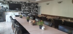 Dnes, keď sa posadíte na terasu reštaurácie, máte pred sebou úchvatný výhľad priamo na golfové ihrisko. Zeleň trávnika sa jemne mieša s modrou oblohou a vytvára tak ideálne miesto pre oddych a romantické chvíle. Vzduch je naplnený vôňou kvetov a jemným šumom vetra, čo pridáva k celkovej atmosfére pokoja a pohody. Interiér reštaurácie je harmonickým spojením moderného dizajnu a historických prvkov. Dlhé stoly pokryté bielymi obrusmi sú zdobené čerstvými kvetinami, ktoré miestnosti dodávajú sviežosť. Pohodlné kožené stoličky lákajú k dlhým rozhovorom pri káve alebo lahodnom jedle. Na stenách visia čierno-biele fotografie, ktoré pripomínajú slávne okamihy z minulosti a dodávajú priestoru kultúrny charakter.