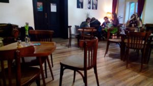 Halmi o sebe hovorí ako o „vintage kráľovstve“, kde každý škrabanec nesie svoj osobitý príbeh. Nábytok tu je naozaj nahlodaný zubom času a takisto aj červotočmi. Táto koncepcia sa snaží vyzdvihnúť unikátnosť či originálnosť a vytvoriť zvláštny druh retro atmosféry. Štýl, v ktorom sa interiér nesie zahŕňa pár evergreenov z minulého režimu, ktoré vo vás môžu evokovať bývanie starých rodičov. Najdominantnejším materiálom je tu drevo a najvýraznejším doplnkom sú tu knihy – je z nich postavený bar, alebo konferenčný stolík. Jedinečnosť každého posedenia spočíva napríklad aj v tom, že miesto tradičného stola vám tu kávu naservírujú napríklad aj na šijací stroj. Interiér kaviarne je vďaka familiárnej atmosfére útulný, no mám zopár výhrad k plávajúcej podlahe – čo sa snáď nepodarilo zachovať parkety z pôvodného bytu? Steny tu prepožičiavajú umelcom, ktorí si tu môžu vystaviť svoje diela, preto sa dekorácie na stenách pravidelne striedajú. Osobne by som však odporúčal steny aspoň čiastočne zaplniť knižnicami, alebo väčšími kusmi nábytku, čo by celý priestor zútulnilo.