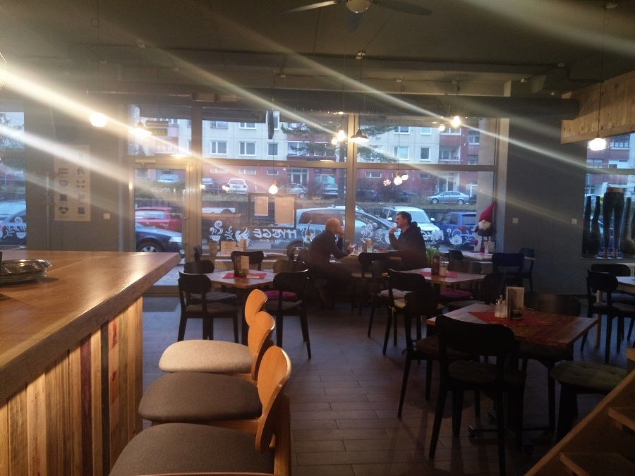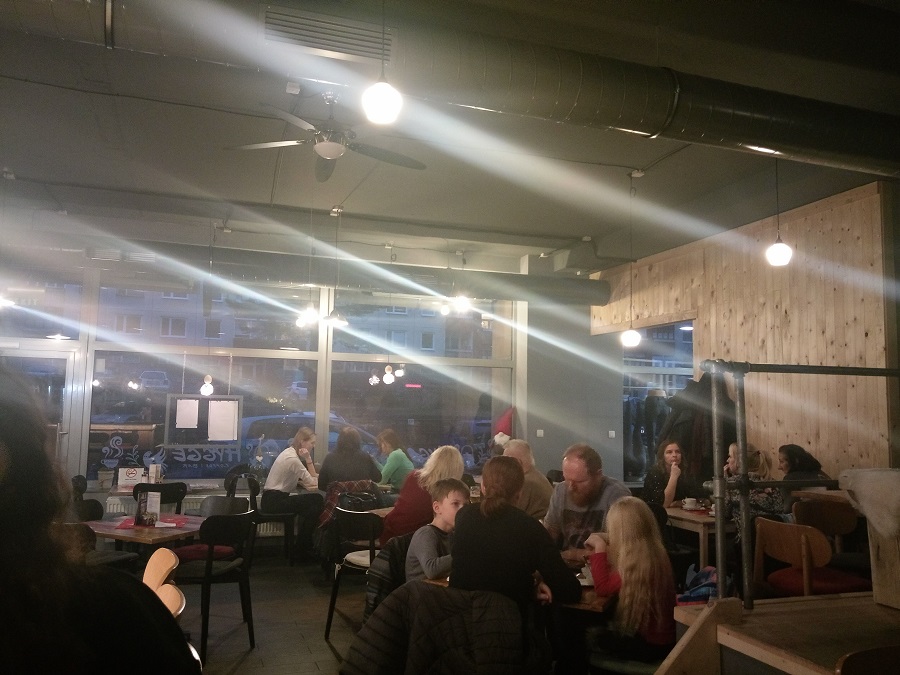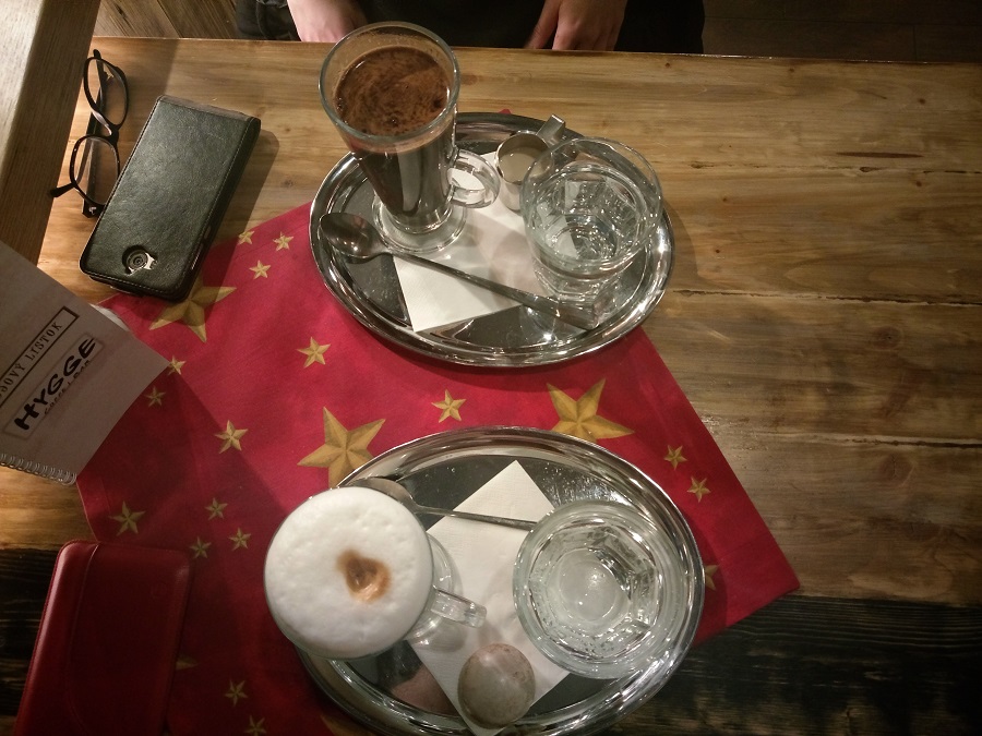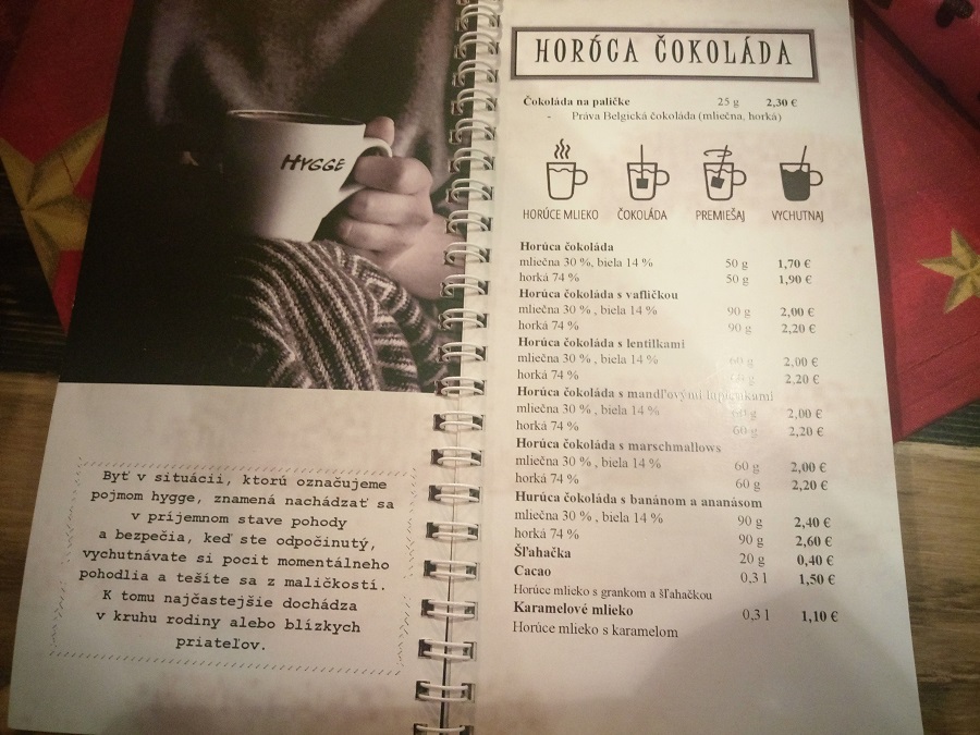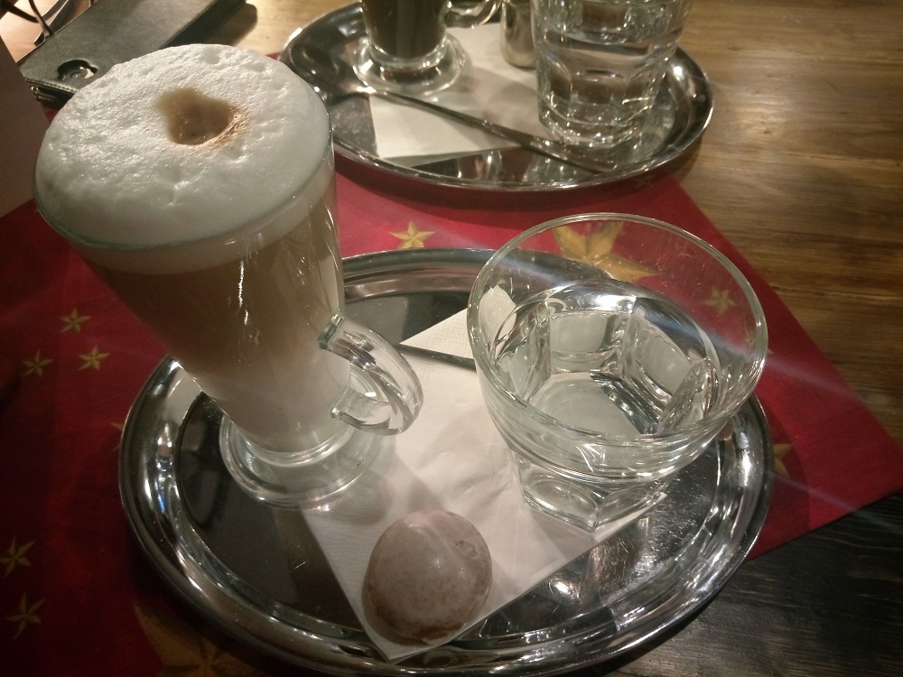 Kaviareň má v ponuke rôzne druhy káv. Ja som si dala Café Latte Machiatto a kamarátka si dala klasickú zalievanú kávu. Ako môžete vidieť aj na fotke, tak káva je veľmi lacná a zalievaná káva stojí 1,10 – pričom dostanete ja mlieko a keksík, cez Vianoce perník. Moja stála 1,70, čo je tiež super cena. Chuťovo káva bola výborná a nemám jej čo vytknúť. Okrem kávy som aj ja dostala vodu, na požiadanie dostanete ja slamku a keksík je samozrejmosťou.