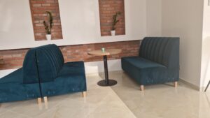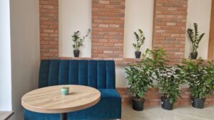Interiér podniku Julyard je zariadený v modernom a príjemnom štýle, ktorý kombinuje prvky pohodlia s elegantným industriálnym dizajnom. Steny sú obložené červeným tehlovým murivom, čo dodáva priestoru teplo a útulnosť, zatiaľ čo tmavomodré lavice s mäkkým čalúnením prinášajú prvok luxusu a komfortu pre zákazníkov. Malé okrúhle stolíky a rastliny umiestnené na stene pridávajú na štýle a sviežosti interiéru, čím vytvárajú pohodlné miesta pre oddych či príjemné posedenie pri jedle. Okrem príjemného interiéru ponúka Julyard aj letnú terasu, ktorá je ideálnym miestom na vychutnanie si slnečných dní. Terasa poskytuje možnosť posedieť si vonku a užiť si jedlo či nápoje na čerstvom vzduchu, čo je počas teplejších mesiacov veľmi populárne medzi návštevníkmi.