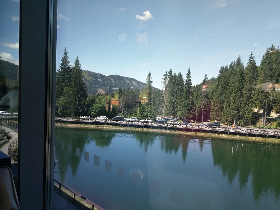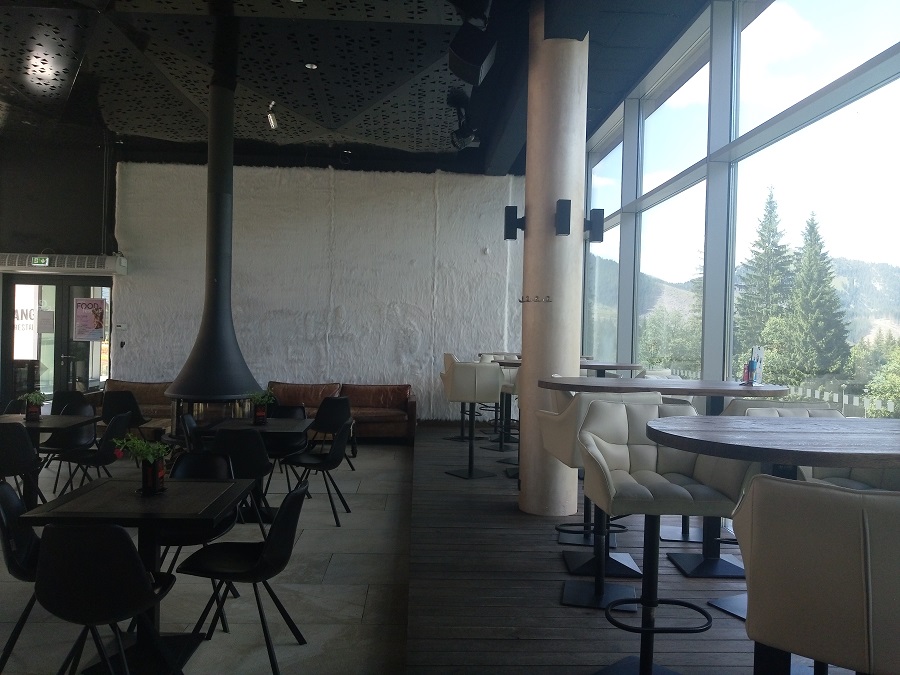 Prostredie je krásne. Veď sme v Nízkych Tatrách. My sme si sadli k oknu, takže sme mali výhľad na jazero a okolité kopce, čo bolo pekné. Mne sa to páčilo. Vo vnútri kaviareň bola tiež veľmi dobrá, krásne zariadená. Bar veľký. Takže v zime to musí byť super. Teraz v lete bolo dosť málo ľudí. A navyše, vonku je aj terasa, takže koho nezaujímajú jazerá, tak sa môže pozerať na stromy a vrchy. Máte na výber!